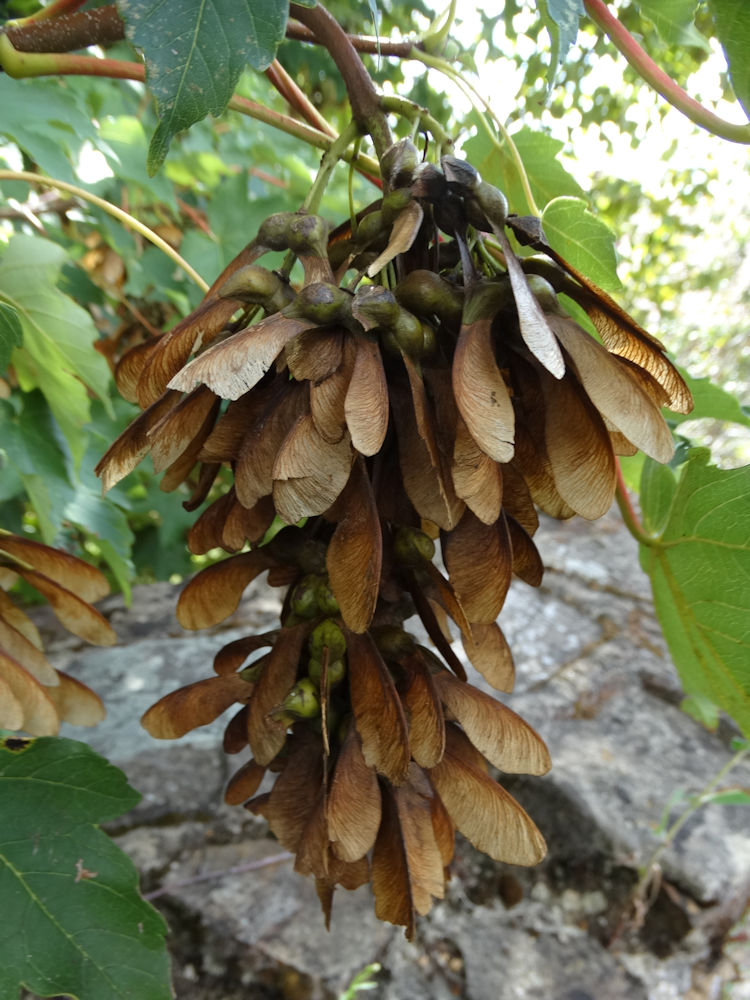 Vanuit de auto zag ik een esdoorn, waaraan hele trossen met 'helicoptertjes' hingen.