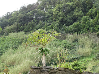 In het dorp zochten we nog even een cache en zagen toen voor het eerst papaja's aan een boom hangen.